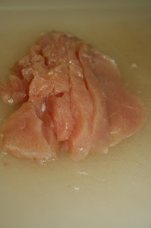 While the stuff in the pan is smelling more and more amazing, I chop up the chicken breasts. This works best of the chicken is slightly frozen, so I'll stick it in the freezer on the cutting board, or, if I'm using frozen chicken, I won't let it defrost all the way.
